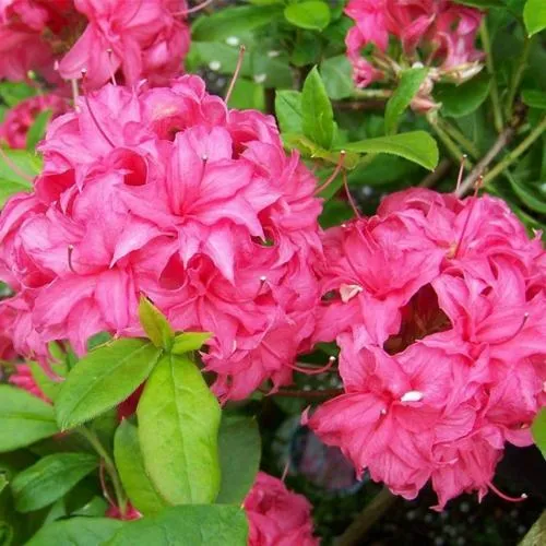 Цветы азалии 'Хоумбуш' — это настоящее произведение искусства. Шарообразные соцветия, состоящие из 8 крупных махровых цветов карминно-розового оттенка, становятся ярким акцентом в вашем саду. Каждый цветок достигает размера 6-8 см и состоит из 9-10 лепестков с лихо закрученными краями. Аромат, исходящий от этого растения, является средним, создавая легкий и притягательный запах, который дополнит общую атмосферу сада.