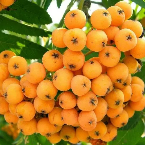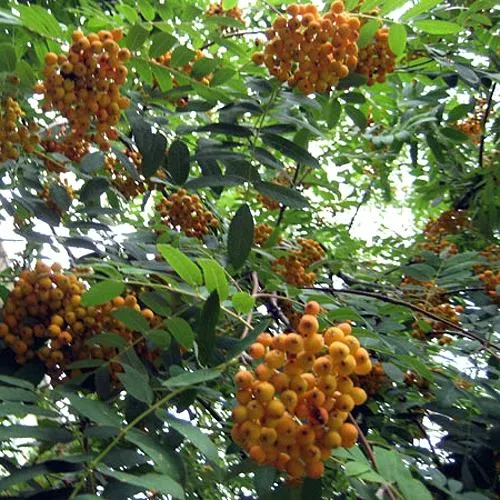 Необычная по цвету рябина, плоды использую для приготовления кваса, варенья, настоек. Заготавливаю способом сушения. Плодов много, ветки прогибаются под их весом но не ломаются.